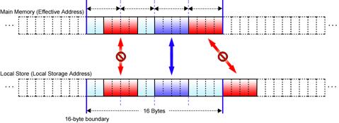 When the data to be transferred is greater than or equal to 16 bytes, the addresses on both sending and receiving sides (i.e., effective address and LS address) must be aligned on 16-byte boundaries. The execution performance of DMA transfer is maximized when the addresses of the data area on both sides begin on a 128-byte boundary.