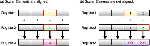 The SPE cannot calculate scalar data unless the position of each data in the register is aligned as in the example of summation in Fig. 4.12 (a). The sum cannot be calculated correctly when data positions are unaligned as shown in Fig. 4.12 (b).